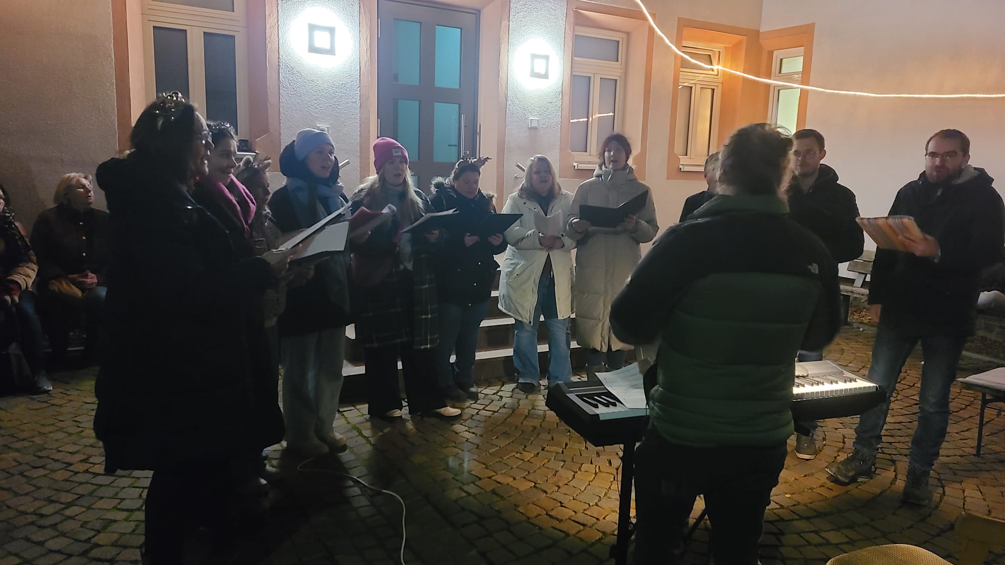 Die Tonblüte nahm dies zum Anlass die Ortsbevölkerung zu einem kleinen Umtrunk mit Weihnachtsliedersingen auf dem Vorplatz des Dalberghofs einzuladen. Den Abend eröffnete der Männerchor mit „Feliz Navidad“ sowie anschließend der gemischte Chor mit einem modernen Arrangement von „Morgen kommt der Weihnachtsmann“ – beide unter der Leitung von Leon Zellmann. Weiter ging es mit dem Weihnachtschor der Tonblüte, der sich stets zur Weihnachtszeit aus Sängerinnen und Sängern der Tonblüte Albstadt zusammenstellt. Unter der Leitung von Jonas Stadtmüller trugen sie den englischen Klassiker „Deck the hall“, ein „Weihnachtliches Abendlied“ sowie das alpenländische „Es war a stille Nacht“ vor. Den offiziellen Abschluss machten der Männerchor und der gemischte Chor mit dem gemeinsam vorgetragenen „God be with you till we meet again“. Zwischen den Liedvorträgen der Chöre war das Publikum zum Mitsingen bekannter Weihnachtslieder eingeladen.